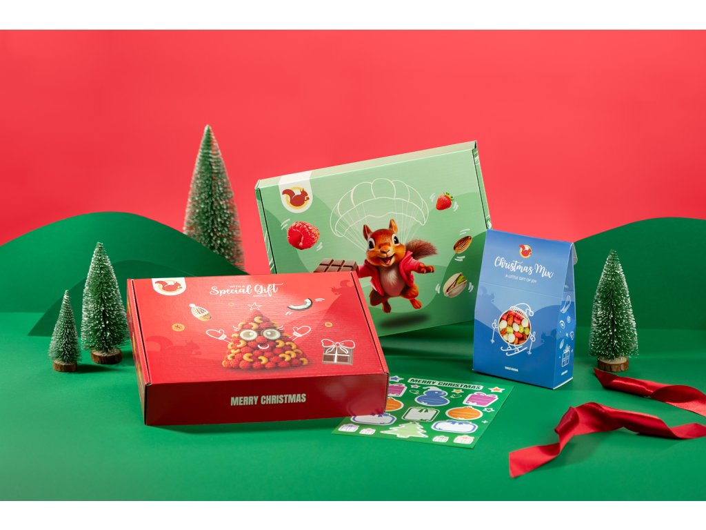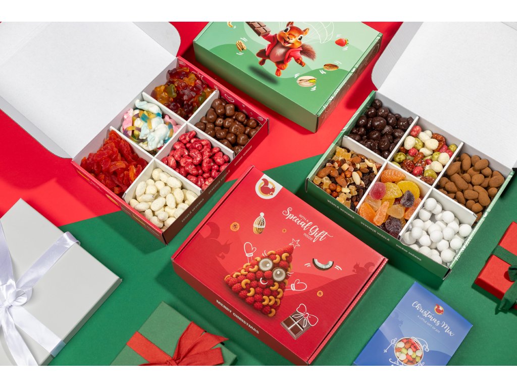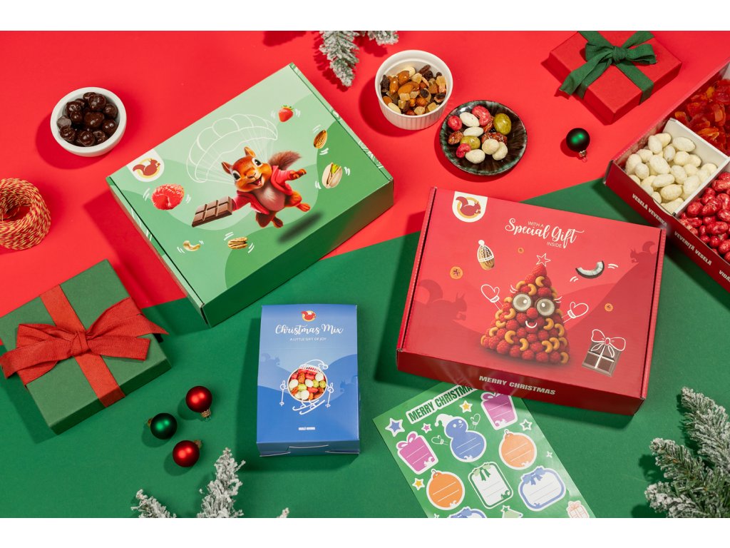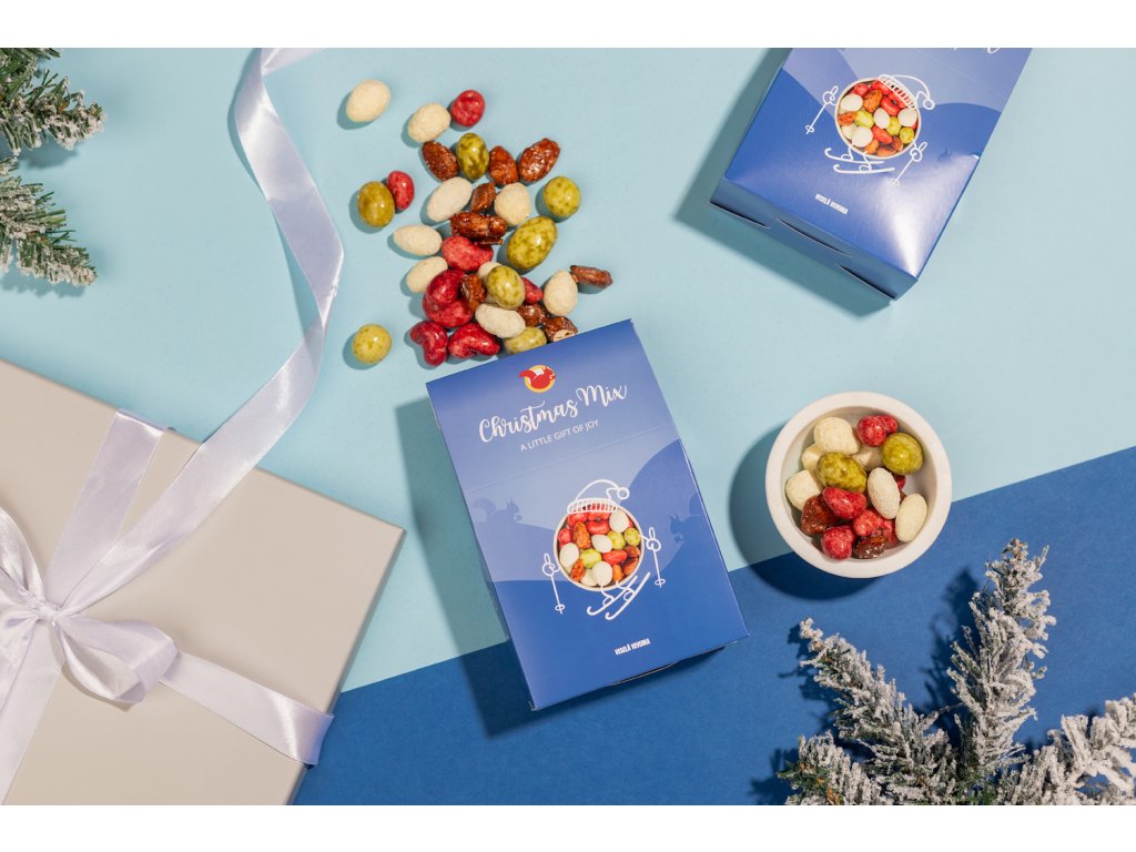 Exkluzív diókeverék: karamellás mandula, kókuszos mandula, zöld matcha és málnás kesudió – mint egy ínycsiklandó dísz a karácsonyfán.
